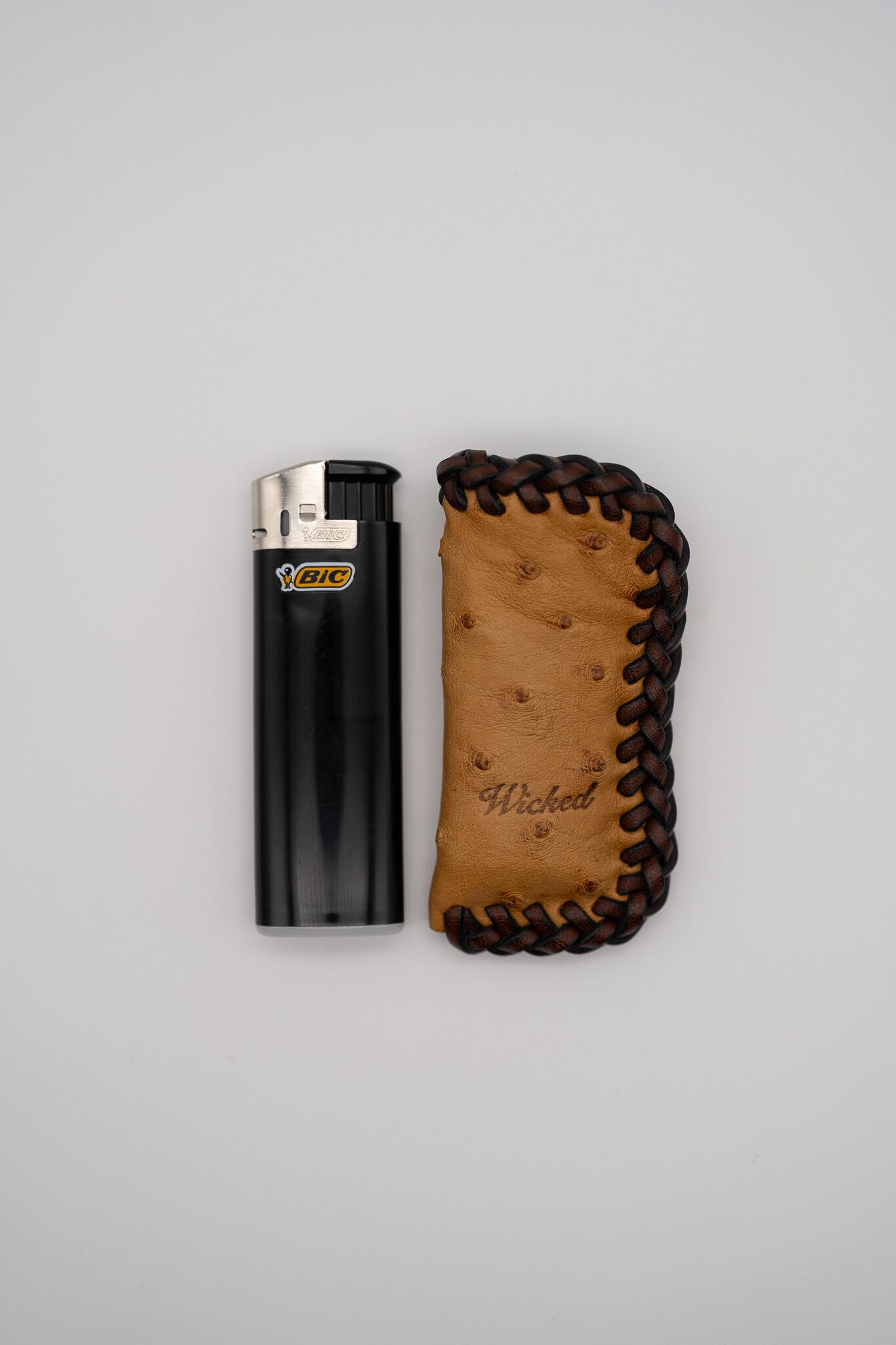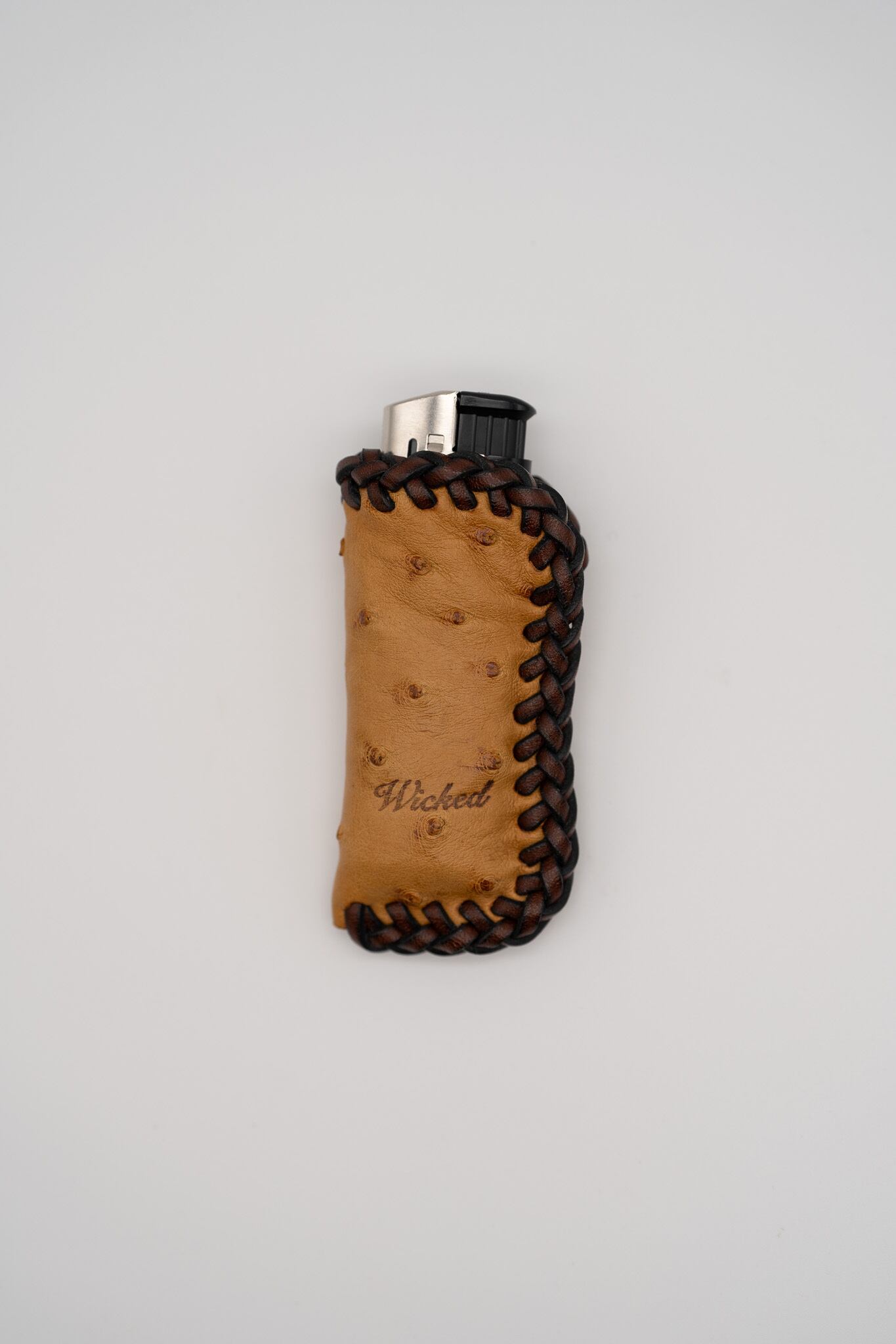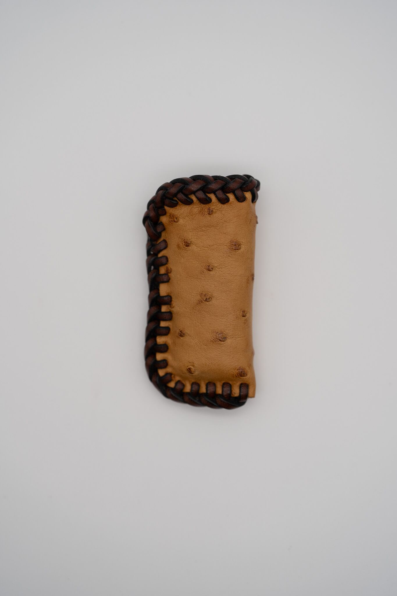 高級皮革「オーストリッチ」に、最高級レザーコード「イタリアンレース」を組み合わせた、手縫い仕立てのライターケースです。